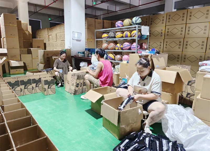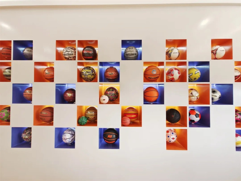 În showroom -ul de produse din Meidong Sports, există zeci de produse de baschet, fotbal și volei de diferite stiluri și culori strălucitoare.